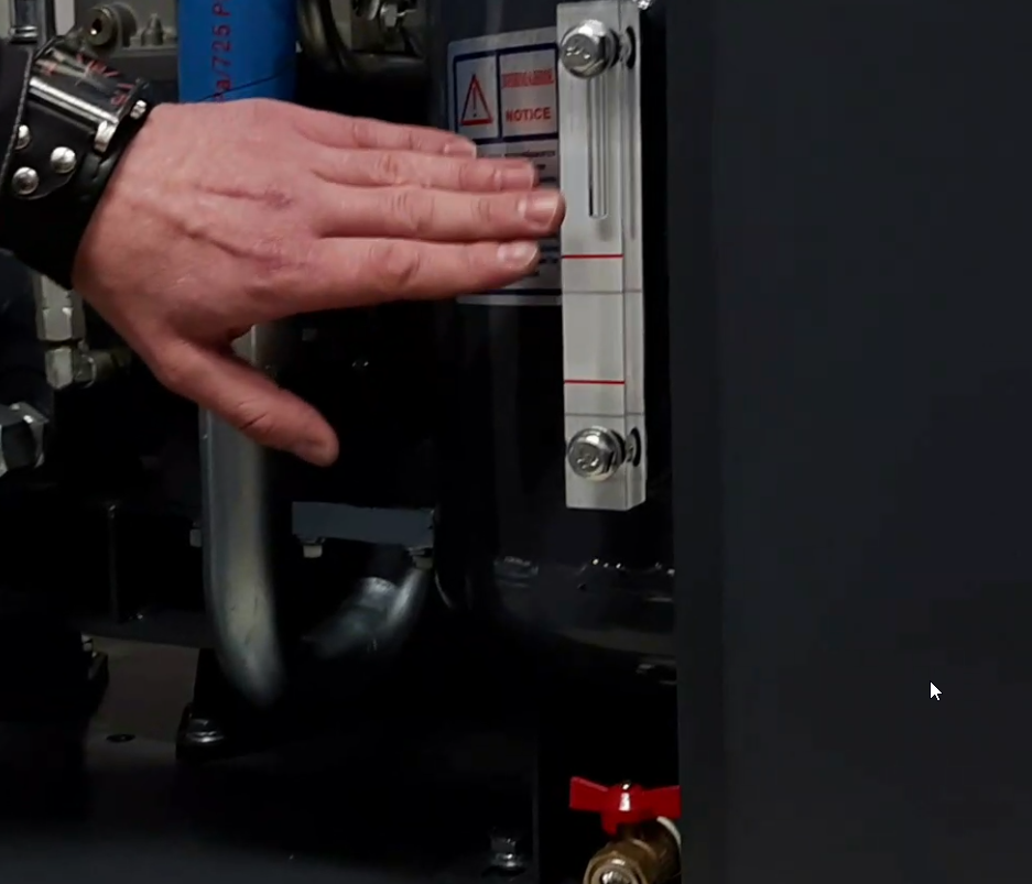 Здесь процесс проще, так как многие модели имеют прозрачное смотровое окно с отметками. Остановите компрессор, дождитесь полной остановки винтового блока — и проверьте уровень. Он должен быть примерно посередине между минимальной и максимальной отметками.