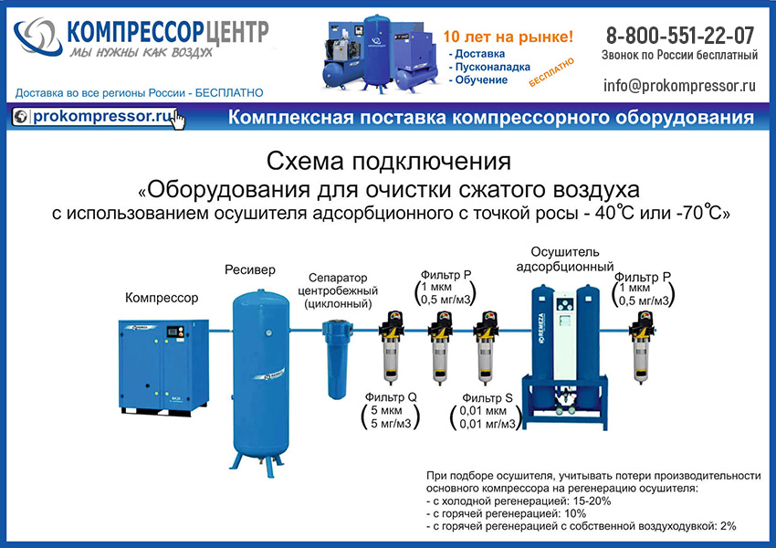 Схема подключения "Оборудования для очистки сжатого воздуха с использованием осушителя адсорбционного с точкой росы -40°С-70°С.