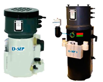 Масловлагоразделители серии D-SEP, D-MAT предназначены для очищения конденсата от масляных примесей перед сбросом в канализацию. Двухступенчатая (трехступенчатая для моделей PLUS) система фильтрация конденсата с использованием угольного фильтра позволяет на выходе получить воду с содержанием масла менее 10 мг/л. Такая вода может сбрасываться непосредственно в канализацию. Предварительный фильтр из тканых пластиковых волокон фильтрует крупные капли масла, разгружая этим фильтр из активированного угля, увеличивая срок его службы. Допустима подача конденсата под давлением и без избыточного давления. Масловлагоразделитель имеет несколько штуцеров для подвода конденсата, и контрольный кран для отбора конденсата на проверку