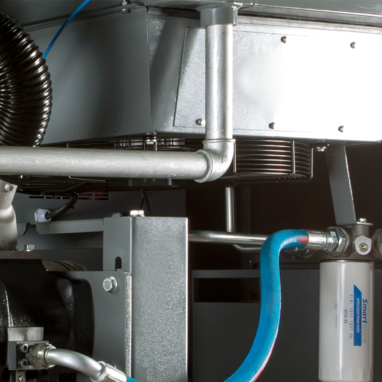 - В двух секциях теплообменника охлаждается масло и сжатый воздух, обеспечивая значение температуры сжатого воздуха на выходе + 7 к температуре окружающей среды.