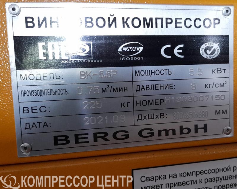 Оборудование: винтовой компрессор "Berg" ВК-5,5РО-500/8