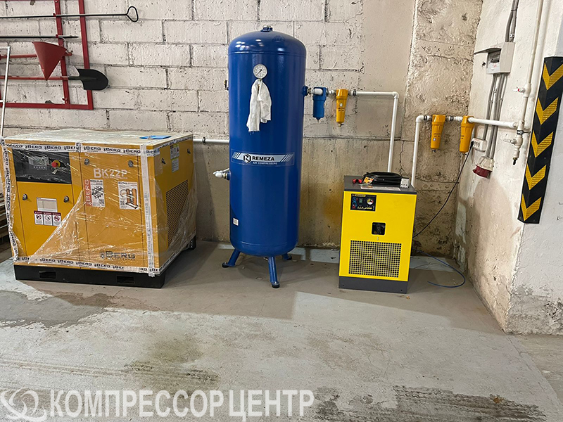 Так в эту поставку входили: винтовой компрессор "Berg" ВК-22Р, рефрижераторный осушитель "Comprag" и вертикальный ресивер "Remeza".