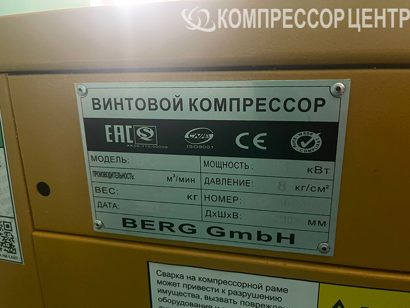 Оборудование: винтовой компрессор "Berg" ВК-11/8 Р