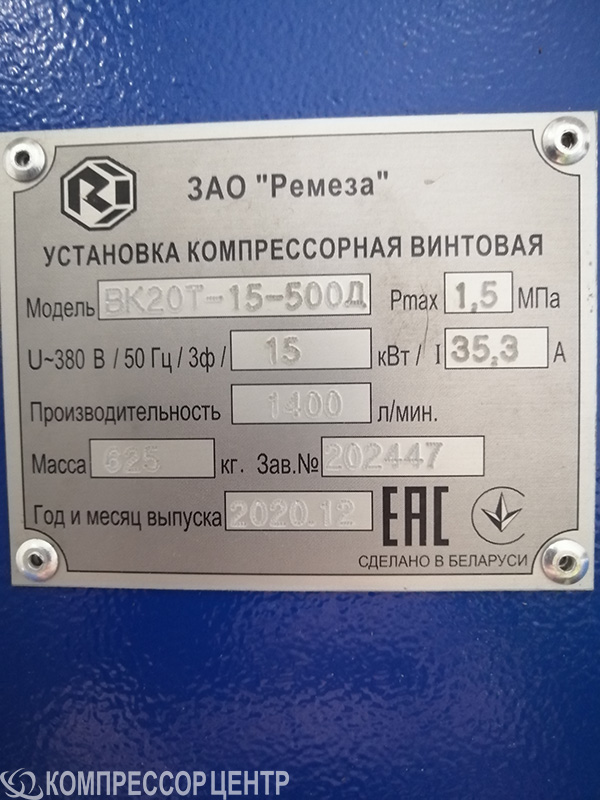Оборудование: винтовой компрессор "Ремеза" ВК 20Т-15-500 Д