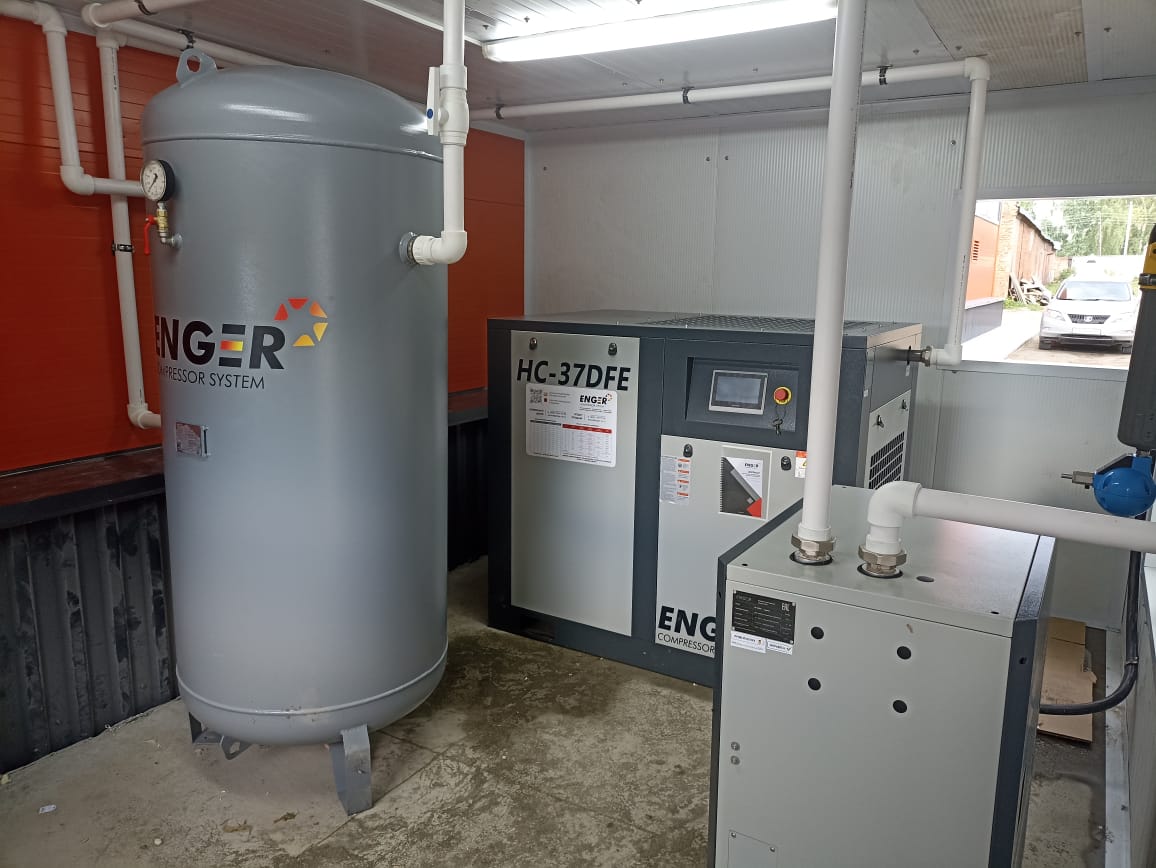 Винтовой компрессор Enger HC-37DFE 8 идеально подошел для этой задачи. Дополнительно в линию установлен рефрижераторный осушитель «Enger» RD-085HA , вертикальный ресивер Enger PB-900/10 G2" (10 бар, 900 л, 2 дюйма), Конденсатоотводчик поплавковый ENGER 04.090.0002 и фильтры.